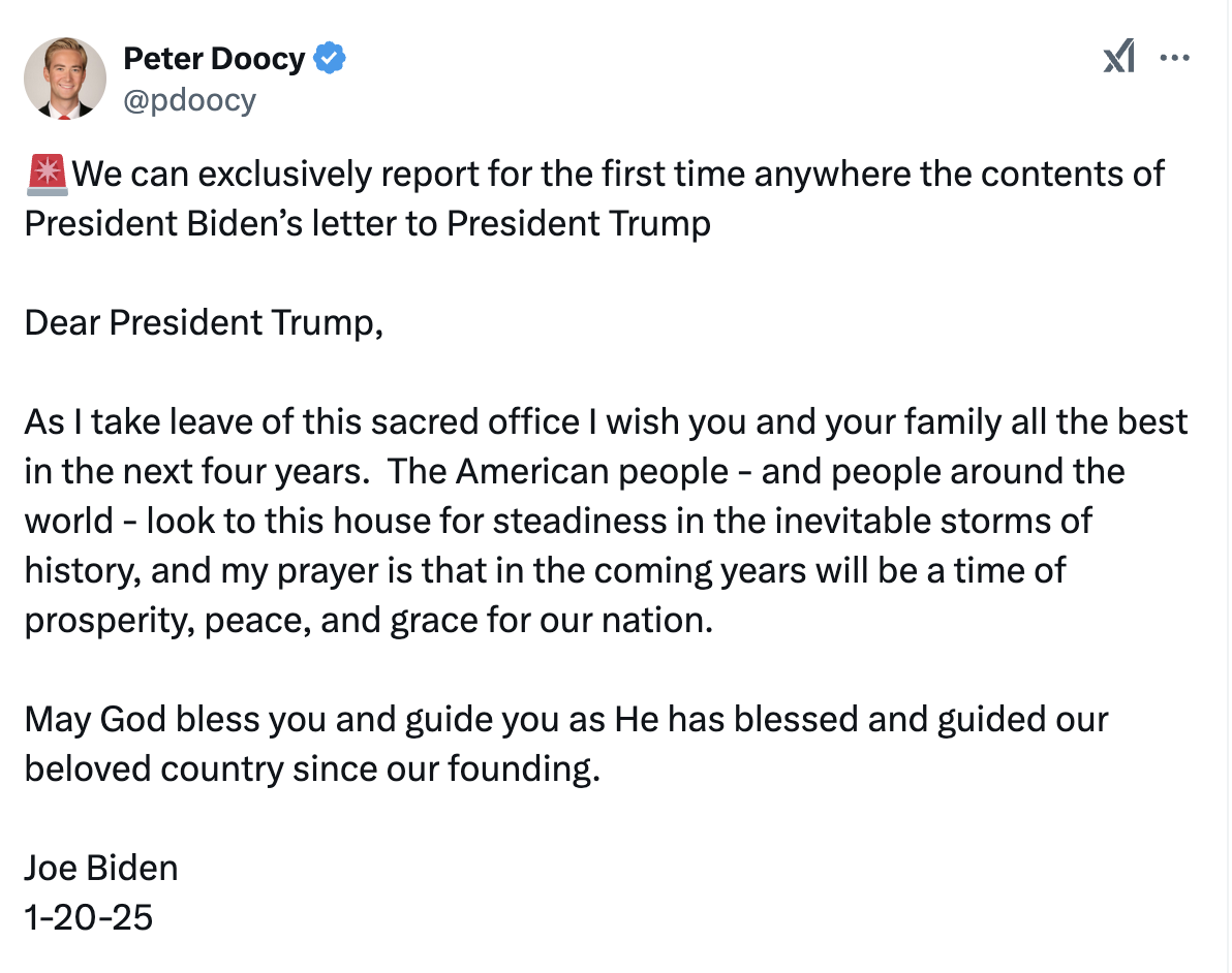 As tradition goes, outgoing presidents write a personal letter to the incoming president with words of wisdom and encouragement for their successor. So we have been curious to know what former President Joe Biden left in his parting letter for President Donald Trump.